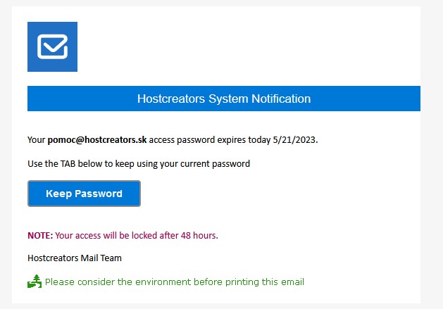 - Odporúčame vždy kontrolovať odosielaciu adresu. V ukážke nižšie vidíte, že email ide z divnej domény a nie z HostCreators. Na tento email teda radšej nereagovať, obzvlášť, ak od Vás žiadajú peniaze. :(