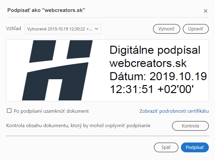 - Visible signature: zobraziť info o podpise priamo v dokumente (zobrazí iba Adobe Reader)