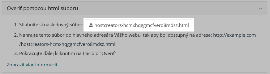 - Nahrajte tento súbor do hlavného adresára Vášho webu, tak aby bol dostupný na adrese http://<vaša doména>/hostcreators-<unikátny kód>.html