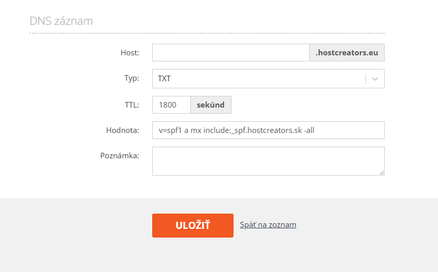 • V zozname nájdete TXT záznam, ktorý má v stĺpci "hodnota" zadané: v=spf1 a mx include:_spf.hostcreators.sk -all