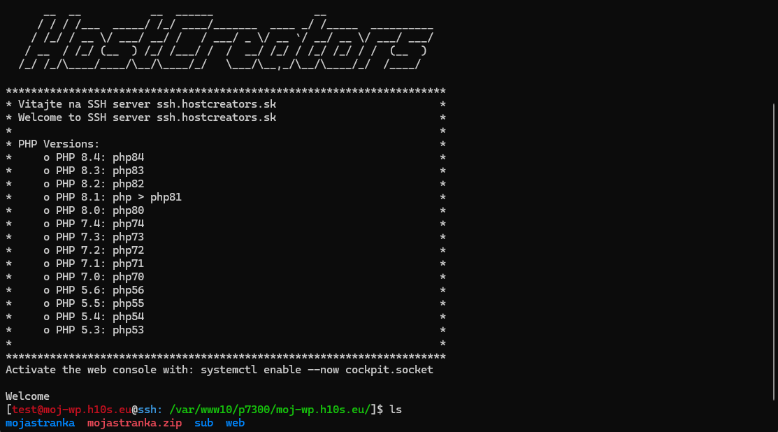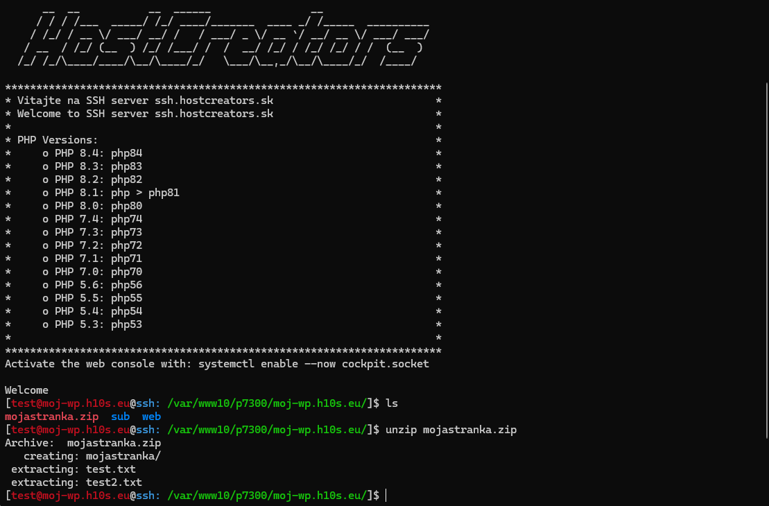 Pre rýchle rozbalenie .zip súboru sa stačí prihlásiť do SSH.