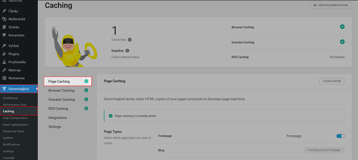 Po načítaní webstránky sa Vám zobrazí na hornej admin lište Hummingbird, cez ktorý môžete zmazať všetkú cache, keď to bude potrebné.