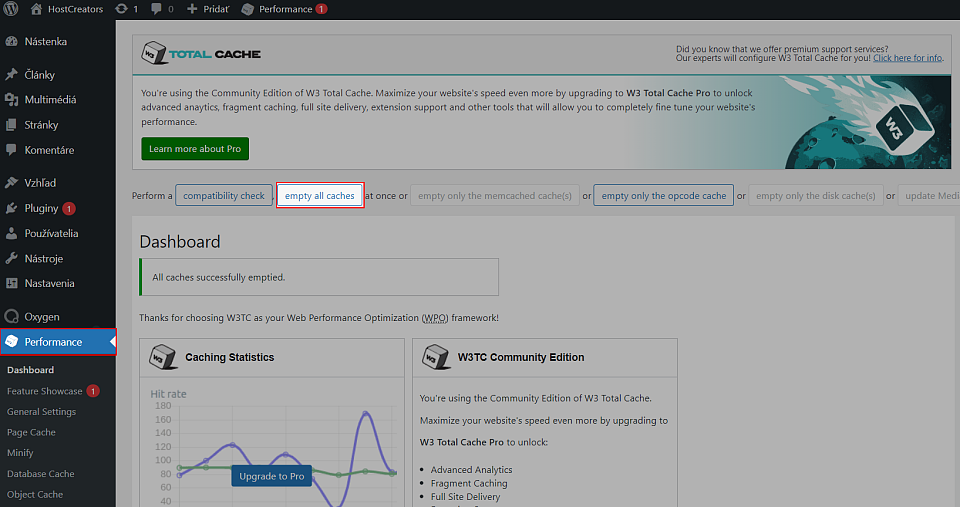 Druhá možnosť je prejsť do samotného pluginu v ľavom bočnom paneli. Kliknite na Performance -> empty all caches.