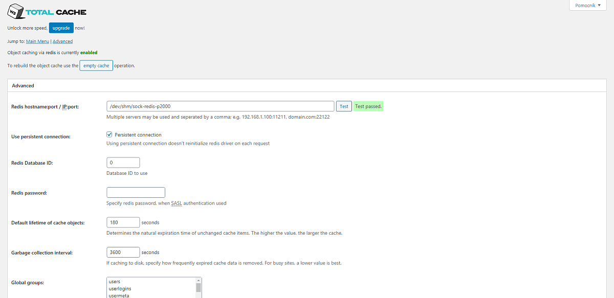 Kedže k redisu môže pristupovať viacero domén, je dobré zabezpečiť, aby mali v redise jedinečné hodnoty. Pri plugine W3 Total Cache sa generuje prefix pre záznamy automaticky, ale odporúčame ešte aj ku každému webu, ktorý má prístup do redisu, prideliť vlastné ID databázy. Tých máte k dispozícií štandardne 16 (od 0 po 15).