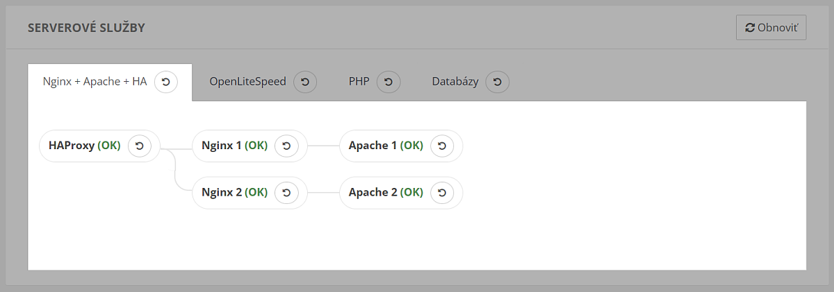 V tejto časti prehľadu VPS sa zobrazujú všetky severové služby s monitoringom funkčnosti všetkých služieb a s možnosťou reštartu ich jednotlivých častí (jednotlivé verzie php, jednotlivé web servery a databázy).