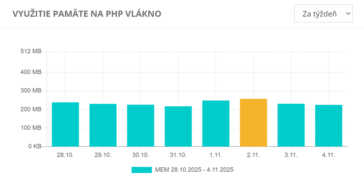 Na grafe je zobrazený súčet využitia pamäte všetkých PHP vlákien hostingového balíka v čase (zahrnuté sú všetky vlákna zo všetkých PHP verzií). Tento údaj slúži najmä klientom využívajúcim virtuálne servery (VPS).