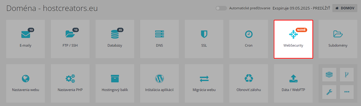 Nastavenia WebSecurity nájdete kliknutím na tlačidlo UPRAVIŤ WEBSECURITY v jeho detaile.