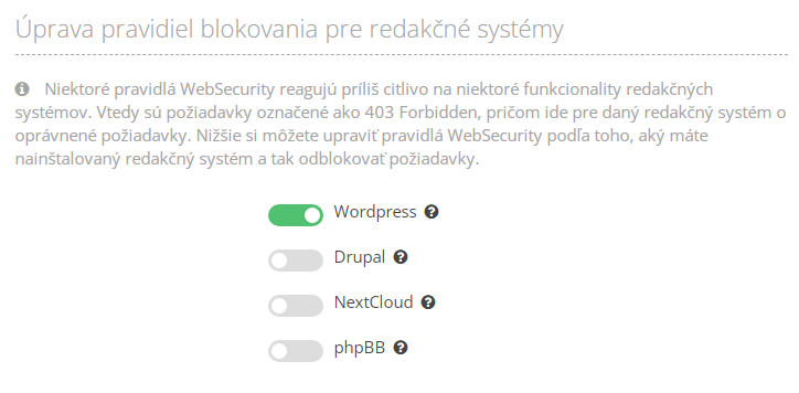 Tu si môžete upraviť pravidlá pre konkrétne redakčné systémy. Hlavne pri WordPresse sa stáva, že aplikácia robí niektoré veci proti bezpečnostným štandardom, napr. posiela PHP kód cez POST request. Pri takýchto prípadoch treba ošetriť WebSecurity tak, aby toto bral do úvahy.