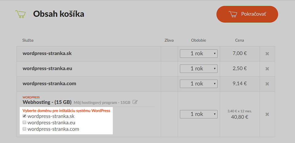 Keďže je v HostCreators webhostingu možné hostovať ľubovoľné množstvo domén v jednom hostingovom balíčku, je potrebné v nákupnom košíku vybrať, na ktoré domény sa nainštaluje WordPress stránka. Vyberieme pre Vás prvú v zozname, ale môžete si vybrať viacero domén, na ktoré bude WordPress automaticky nainštalovaný.