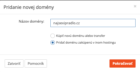 Do voľného poľa napíšte názov domény bez www. A následne zvoľte druhú možnosť “Pridať doménu zakúpenú v inom hostingu”.